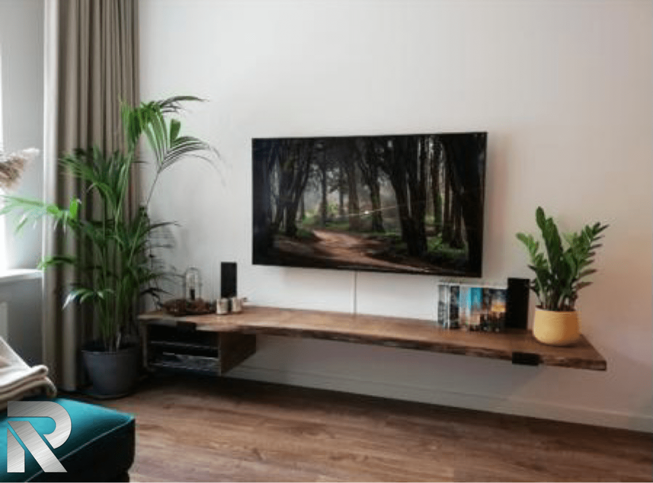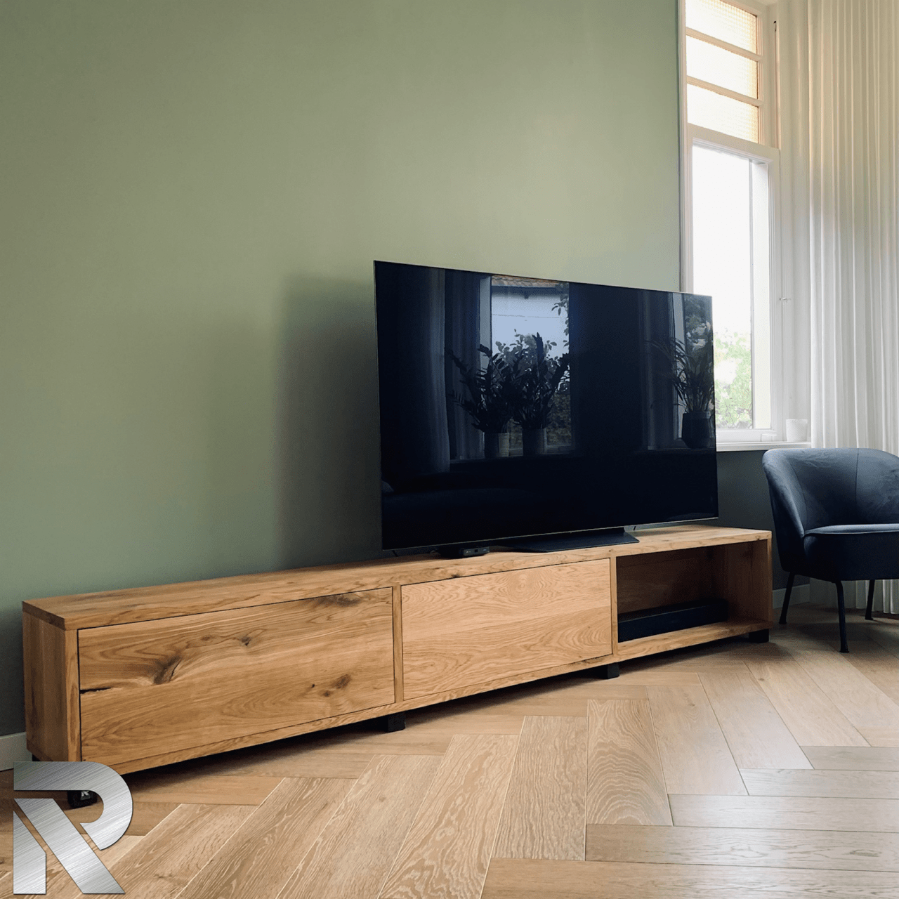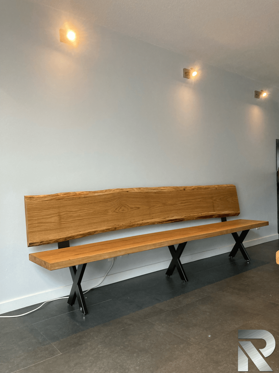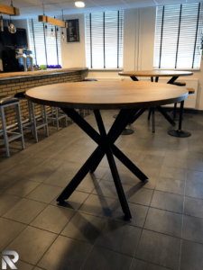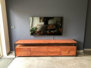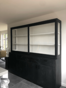 Woonkamer Kast en eettafel Eiken planken in bestaand meubel Bank en salontafels Houten blad Eikenhout HxBxD 2.18X1.80×40